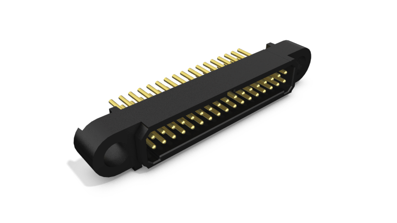 Two-row connector with 6,10, 20, 34 or 50 signal contacts with locking or racking fixings.